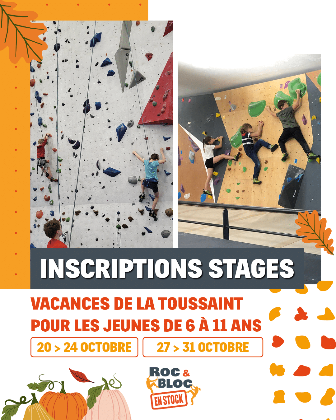 Inscriptions en ligne : https://client.bloc-en-stock.fr/stage-d-escalade-6-18-ans